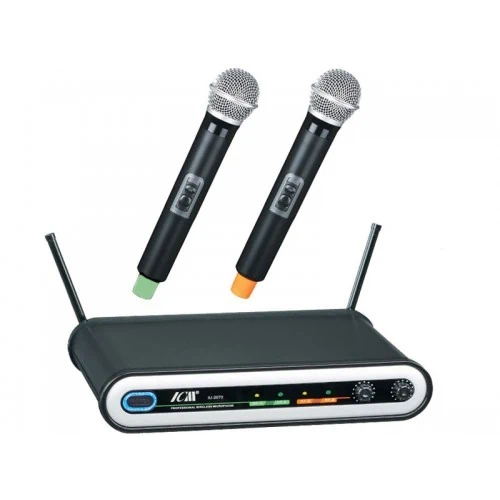 סט של שני מיקרופונים אלחוטיים ידניים עם משדר UHF.